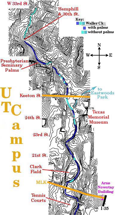 In the summer of 2003 some 400 Texas Palmettos (Sabal mexicana; also Rio Grande palmetto) were thriving along Waller Creek between Hemphill Park and the south edge of the UT campus. When Texas palm authority Landon Lockett suggested that I check out reports of palmettos along campus stretches of Waller Creek I had no idea of the surprises that lay ahead. As a frequent visitor of the creek in the 60s, I knew that palmettos would have to be of recent origin. I was familiar with our local Dwarf Palmetto (Sabal minor) at Palmetto Park and in the hills just west of Austin. There had been student reports of Dwarf Palmettos in the creek and Landon had recently introduced me to the large population of Texas Palmettos in the Hyde Park neighborhood just north of campus.