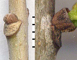 Only recently I discovered a key that employs leaf scars to distinguish the green ash (F. pensylvanica) from the white ash (F. americana). Numerous web sites illustrate this difference. (Google: "leaf scar" "green ash" "white ash".) Since Texas ash is commonly considered to be a variety of F. americana (i.e., F. americana var. texensis), leaf scars provide one possible test to distinguish the two species. With F. albicans the top of the leaf scar is more strongly notched, with a lateral bud in the notch. With F. pensylvanica the top is relatively flat or only slightly notched, with a lateral bud above the scar. This often demands the inspection of several recent leaf scars to make a determination – to locate tokens of an unambiguos scar. Older leaf scars are commonly misleading, as the growing bud has expanded into the top of the scar.