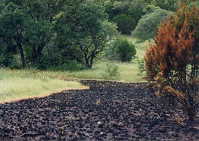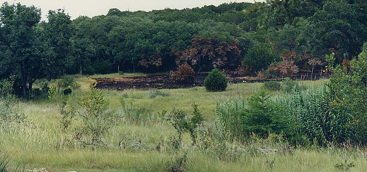 On July 27, 1988, there had been a very light rain, c. 0.01", followed in mid afternoon by a high temperature of 97° F and many dry lightning strikes all around our cabin. One strike had hit a brush pile just east of a large KR field and continued to simmer without producing any smoke. We left in the evening unaware of this, and when I returned two days later, my gate lock had been cut and in our valley discovered a large blackened field defined by paths I had recently mown. I was told by a neighbor that that evening someone in the area noticed the smoke and notified the Dripping Springs volunteer fire department. They had opened my gate, gone down the steep road to the valley to the fire site, but decided to let the fire burn itself out.