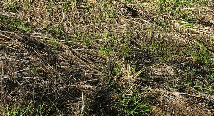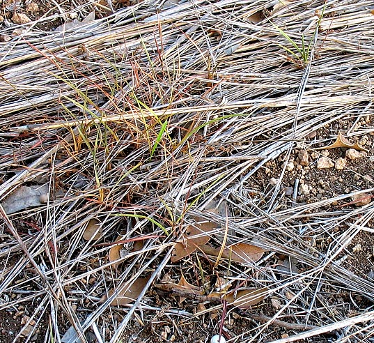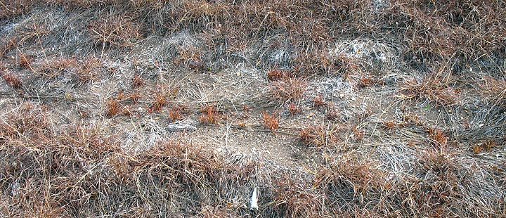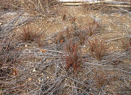 The little bluestem germinated after a very short rainy spell the end of April, creating long rows of fresh green seedlings only in the areas covered by fall culms.