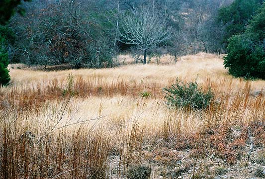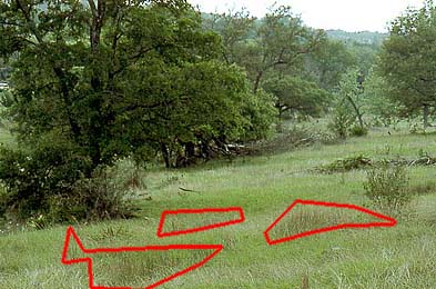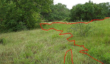 | Two views of the same area, the agarita bush is a common point of reference. Little bluestem is within/above the red areas; otherwise KR bluestem. | |