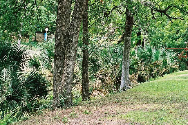 A dozen tall Texas Palmettos, evenly spaced, line the east bank of Waller Creek at the Austin Presbyterian Seminary. Although they had not flowered or produced fruit in summer 2003, the groundskeepers remembered the fruit size to be large enough to rule out Sabal palmetto, another palmetto often used for landscaping. The senior groundskeeper said that the palms were in place when he first came to the seminary some twenty years ago.