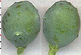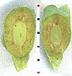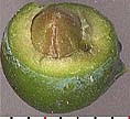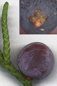 The ovulate cone consists of 3 ternate scales (a single whorl) or, more commonly, 2 pairs of decussate scales. The sporophyll tips or scales (those which become a tiny flap on the fruit coat) are finely toothed on the margin. The lower sporophyll pair usually has one fertile member resulting in a single-seeded berry-cone. Often the two upper bracts or leaves contribute to the fleshy mature "berry," but they invariably remain at the very base of the fruit. Just after pollination the sporophylls elongate rapidly, so that the young cone becomes about twice a long as wide and looks like a tiny urn. Then the fruit scales begin to grow and completely close over the ovules, pushing the sporophyll tip apart and increasing the girth of the fruit.